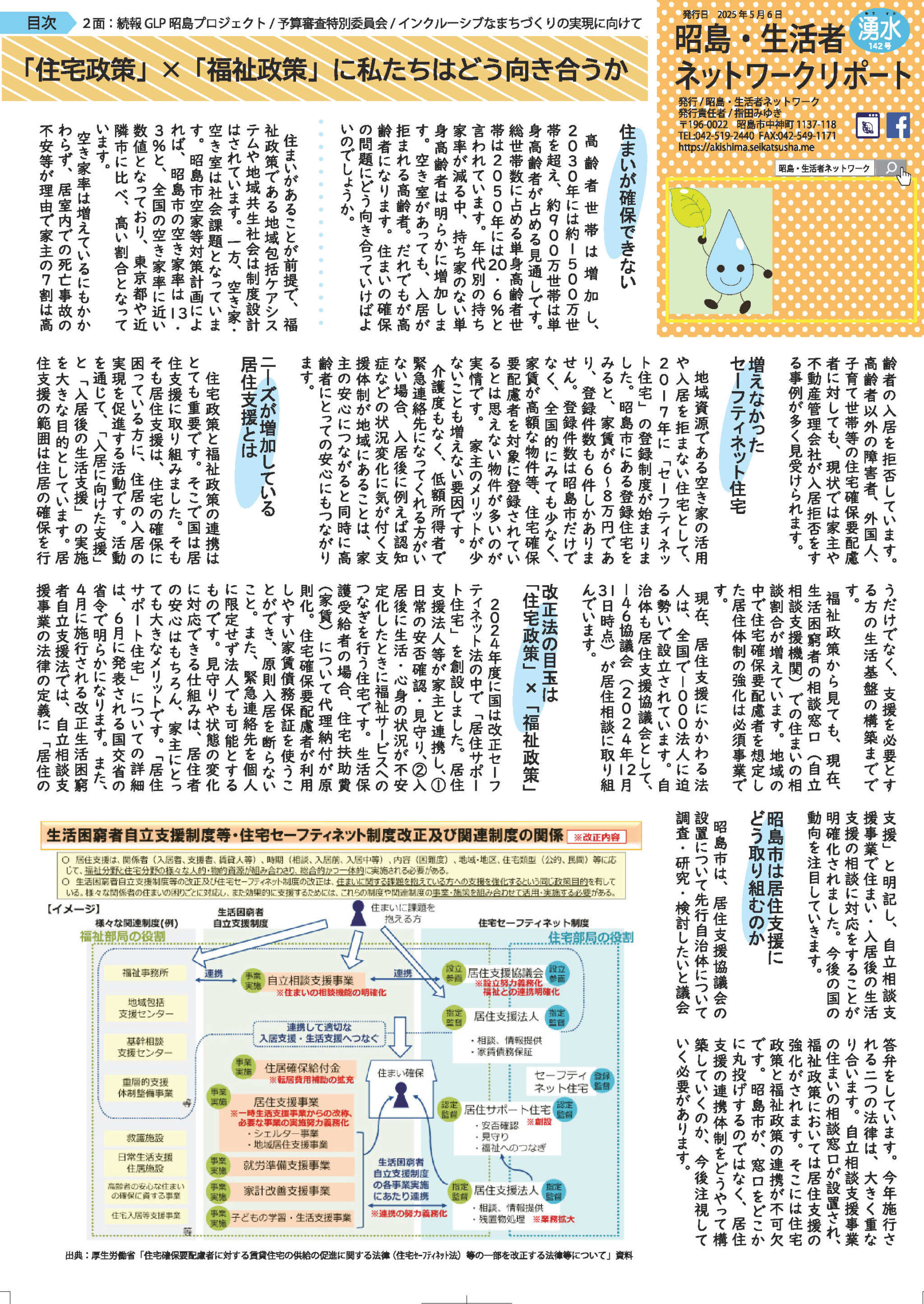 2025年5月10日 / 最終更新日 : 2025年5月10日 hayashimaiko 昭島駅北口大規模開発 2025年3月議会報告レポート臨時号(GLP昭島プロジェクトの最新状況の報告) 先日、昭島・生活者ネットワークリポート142号を発行、二面でGLP昭島プロジェクトについて取り上げていましたが、 その後4月10日・11日に開催された2つの審議会の審議結果、4月25日開催のGLPによる造成工事説明会など含め内容更新した臨時号を発行しました(一面「住宅・福祉政策」については、変更ありません)。 前回発行時に取り上げなかった、予算審査特別委員会、インクルーシブなまちづくりに向けた一般質問についても追記しています。 ぜひご覧ください。 FacebookXBlueskyHatenaCopy