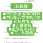 2025年9月28日 / 最終更新日 : 2025年9月28日 hayashimaiko 議会・委員会質問 2025年9月決算審査特別委員会:総務費(市民活動場所の確保、市民総合交流拠点の市民参加、人権啓発、危険樹木対応、プール整備) 昨年度の決算審査特別委員会が終了しました。 費目ごと順をおって報告します。 まずは総務費です。 ◆市民活動場所の確保 地域コミュニティ活動連携推進計画に関連し質問。 計画では、市立開館や学校などの公共施設のあり方の検討や […]